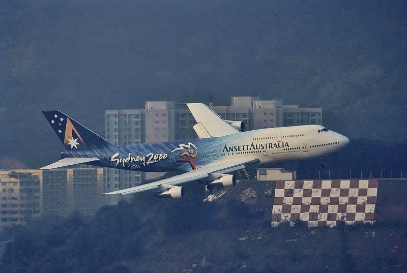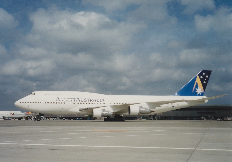 No.15384で紹介した機体の反対側です。この当時は低感度(ISO50)のポジフィルムを常用していたので、着陸してから スポットまでタキシングする、わずかな時間が日没後は貴重でした。この写真を見ても、すでに背景が流れていますね。 それでもNo15384では翼に隠れて見えなかった、デザインの全体像が見えるので紹介してみました。 Ansett AustraliaのB747-312(VH-INJ/製造番号23029/590)。 明日から三沢の航空祭に行くので、二回はお休みになると思います。